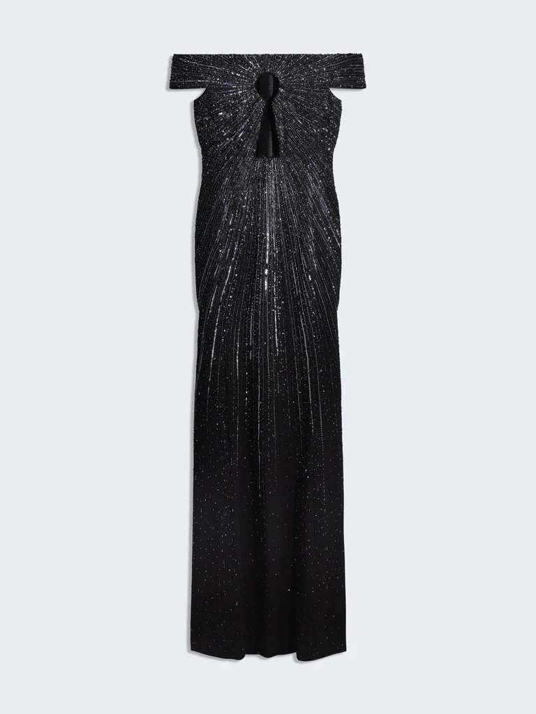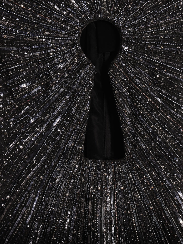 Cette robe longue est confectionnée dans un jersey léger drapé noir dont les plis convergent en un jour en forme de Trou de Serrure qui révèle la peau du décolleté auCentre et entouré de broderies en sequins, perles et fil ton sur ton inspirées de la Cape Apollon des archives de la Maison.
