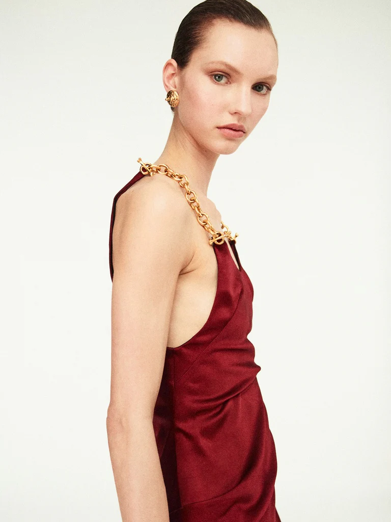 Cette robe sans manches twistée a été réalisée dans une laine technique bordeaux. Elle est agrémentée de bretelles bijoux à gros maillons en laiton doré martelé.