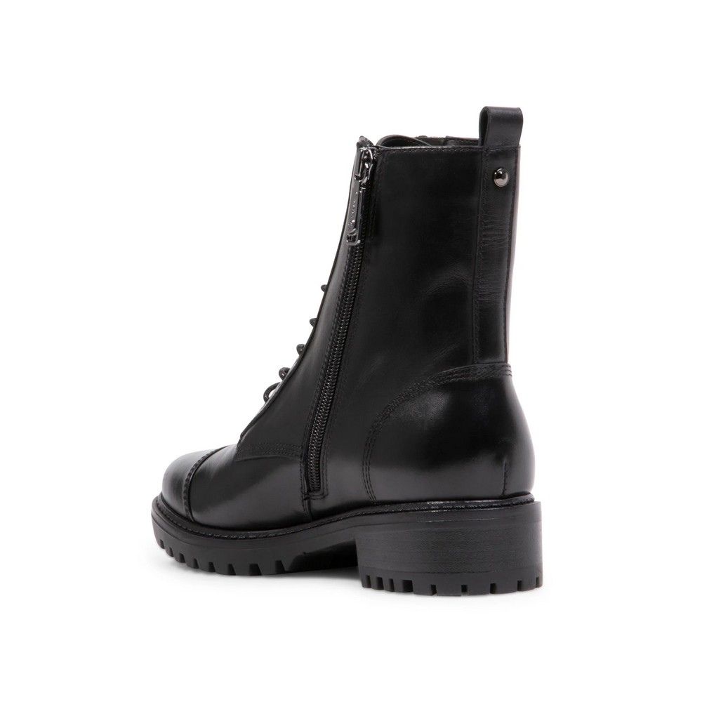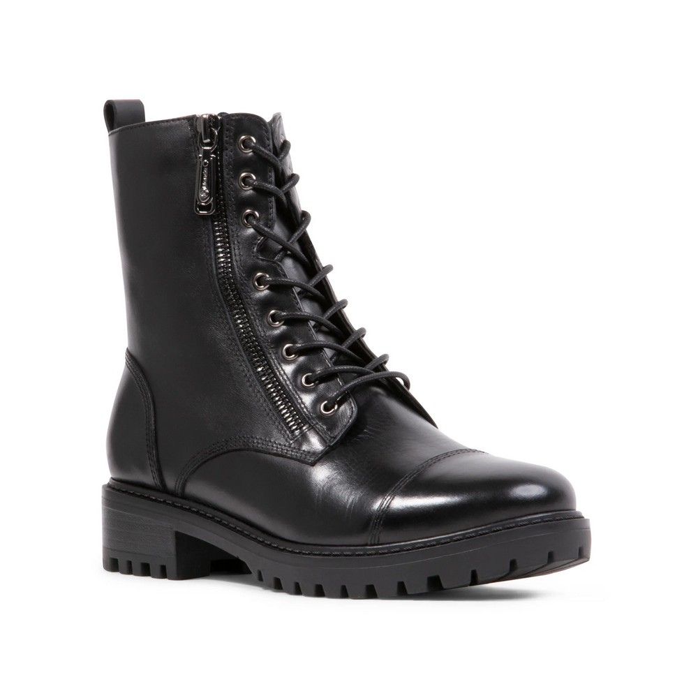 Affirmez votre style hivernal avec ces bottes noires Blondo Skylar pour femme. Confectionnées en cuir de première qualité, ces bottes imperméables de style militaire sont dotées d'un bout rond renforcé, d'un laçage sécurisé sur le devant et d'une fermeture éclair intérieure, d'une languette arrière, d'une doublure douce en polaire, d'une semelle intérieure en feutre pour un confort optimal, d'une fermeture éclair extérieure, d'un talon bloc offrant un bon maintien et d'une semelle extérieure crantée en caoutchouc naturel résistant pour une adhérence optimale.