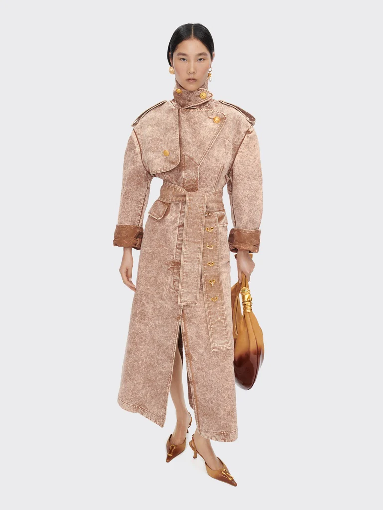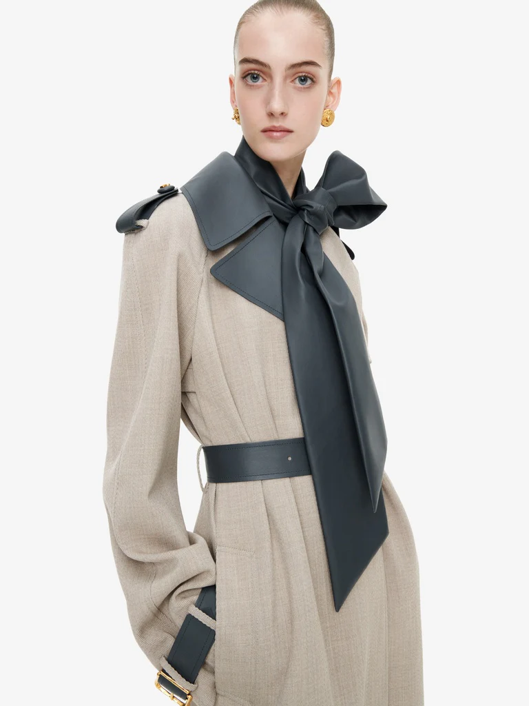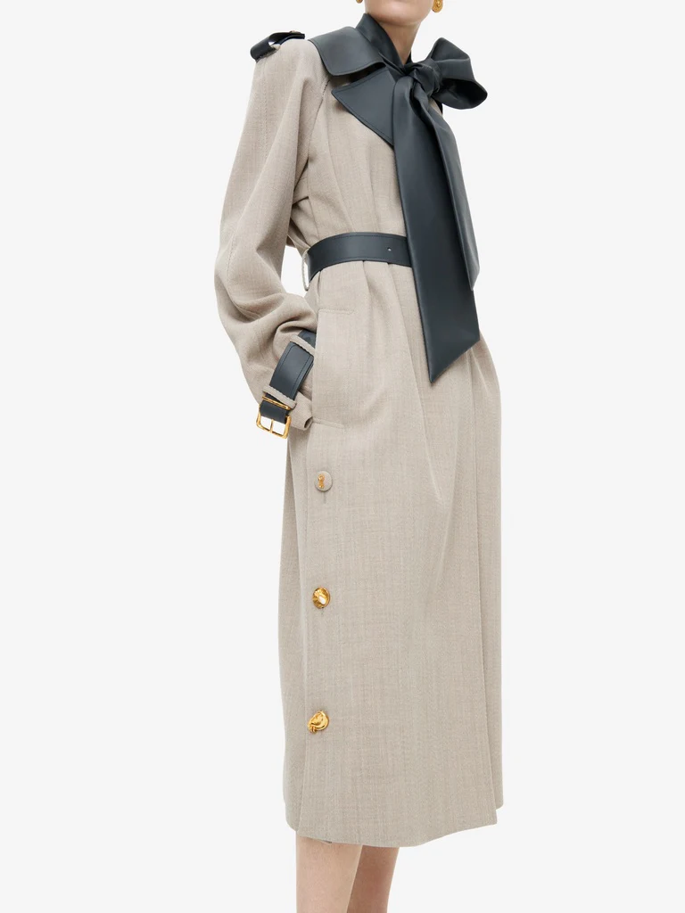 Ce trench en gabardine de laine sable est rehaussé d’empiècements en cuir noir contrasté au col,Ceinture, aux épaules et aux poignets, ainsi que de fentes sur les côtés refermées par des boutons bijoux dorés.
