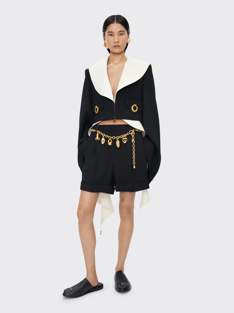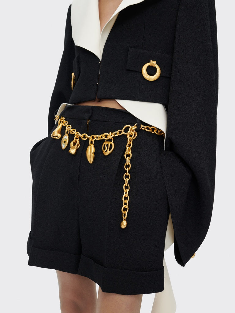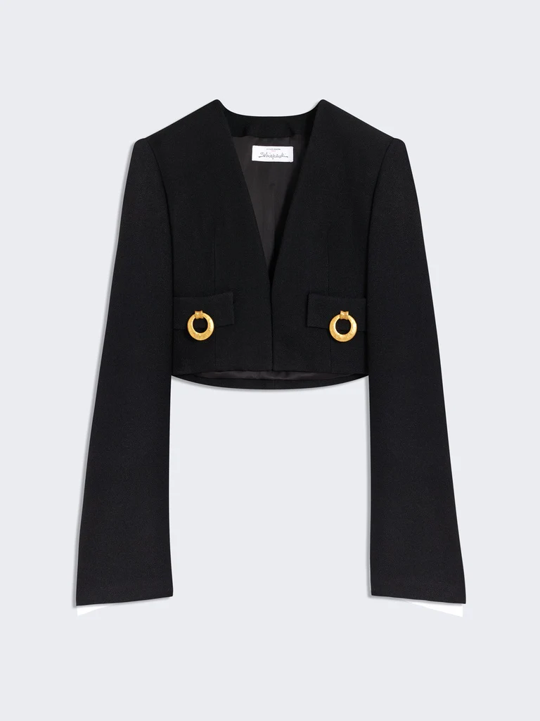 Cette veste sans col à épaules carrées est réalisée en viscose texturée noire. Elle est agrémentée de manches évasées et d’un décolleté vertigineux. Elle est décorée de poches tiroirs trompe l’œil ornées de poignées de porte en métal doré.