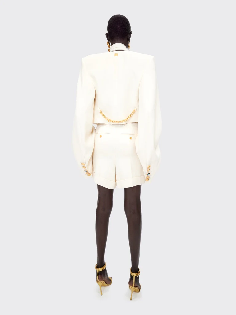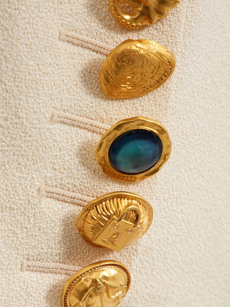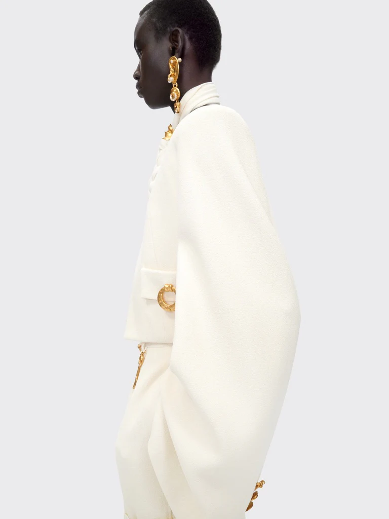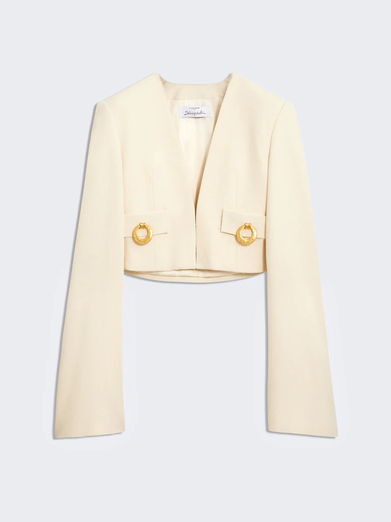 Cette veste sans col à épaules carrées est réalisée en viscose texturée écrue. Elle est agrémentée de manches évasées et d’un décolleté vertigineux. Elle est décorée de poches tiroirs trompe l’œil ornées de poignées de porte en métal doré.
