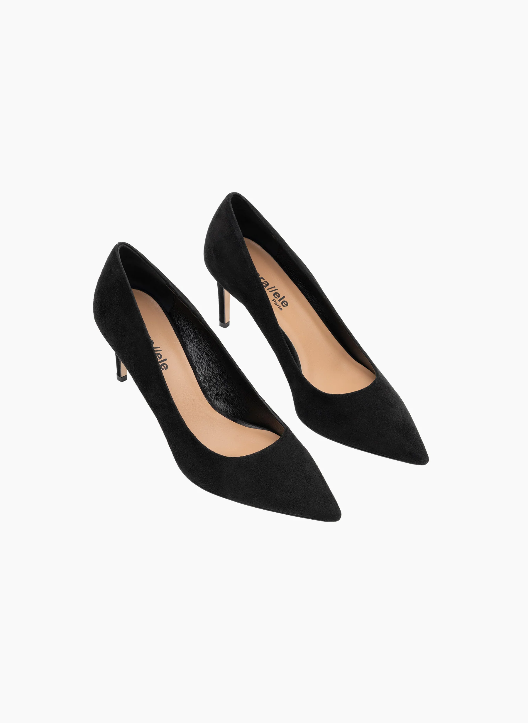 Escarpin à bout pointu en cuir chèvre velours noir.