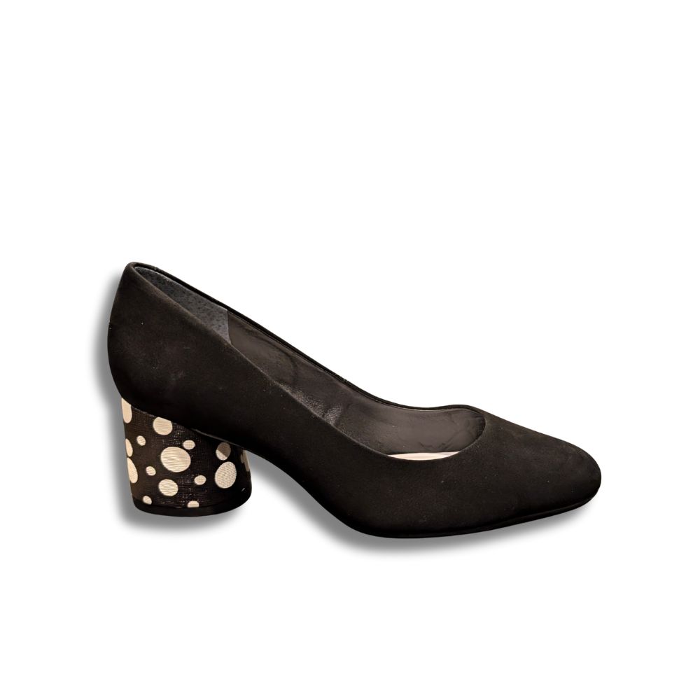 Cet escarpin noir de la marque Capelli Rossi séduit par son élégance intemporelle et la qualité de son cuir d’une douceur exceptionnelle. Habillé de suède noir raffiné, il se distingue par un talon original orné de pois blancs, apportant une touche de fantaisie subtile et chic. Un modèle unique, idéal pour rehausser une tenue avec style et caractère.